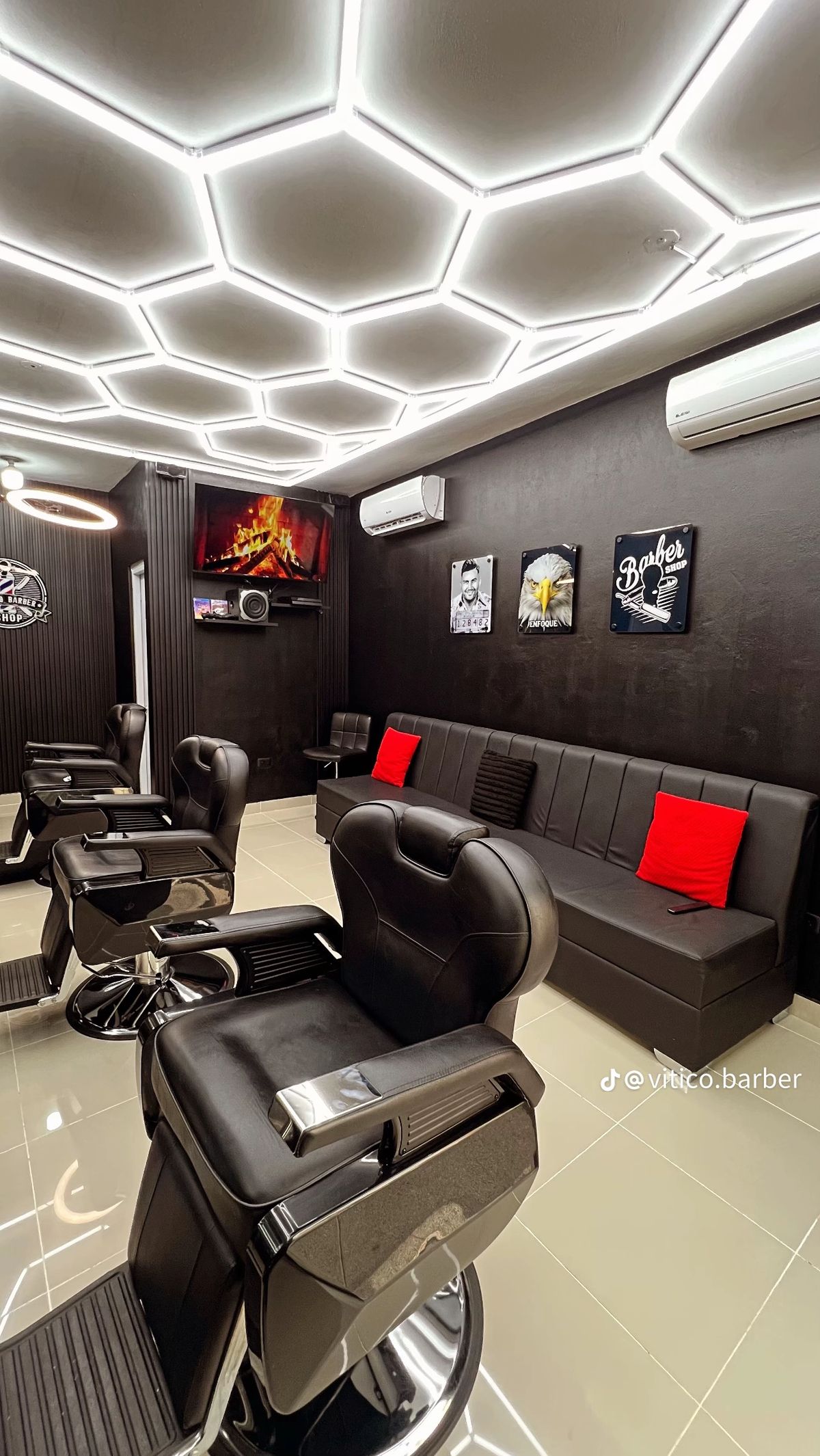 As you can see in this image, black works as a perfect base when combined with strategic lighting. This barbershop uses: